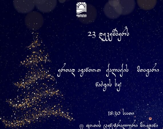 23 დეკემბერს, 18:30 საათიდან, ფოთის ცენტრალურ მოედანზე, ქალაქის მთავარი ნაძვის ხის ანთების ცერემონიალი გაიმართება. საკონცერტო პროგრამით თქვენ წინაშე ადგილობრივი შემოქმედებითი ჯგუფები წარდგებიან. საღამოს მუსიკალურად DJ გააფორმებს.