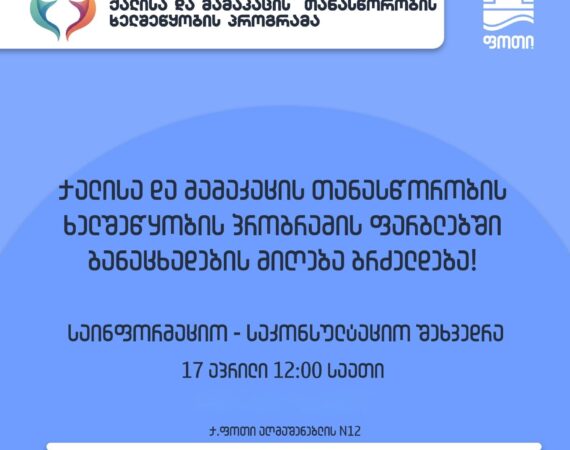 17 აპრილს, 12:00 საათზე, ქალისა და მამაკაცის თანასწორობის ხელშეწყობის პროგრამის პირობებსა და კონკურსზე წარმოსადგენ დოკუმენტაციასთან დაკავშირებით მოქალაქეებისათვის საინფორმაციო-საკონსულტაციო შეხვედრა გაიმართება. მისამართი: ქ.ფოთი, აღმაშენებლის N 12 ინფორმაციისთვის: საკონკურსო განაცხადების მიღება 27 აპრილის ჩათვლით გრძელდება! ქალისა და მამაკაცის თანასწორობის ხელშეწყობის პროგრამის ფარგლებში, „ადგილობრივ დონეზე ქალთა სოციალურ-ეკონომიკური გაძლიერება/ ხელშეწყობის“ ქვეპროგრამას ქალაქ ფოთის მუნიციპალიტეტი...